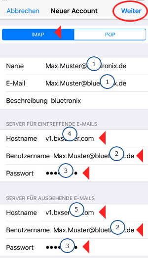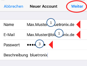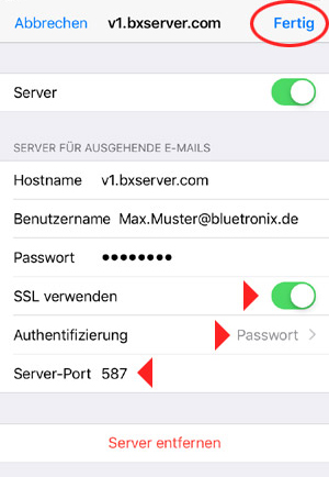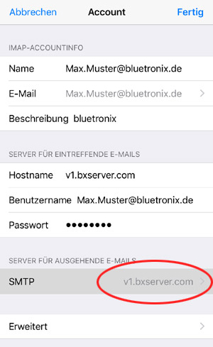 Tippen Sie auf Einstellungen Passwörter & Accounts bluetronix Mail Account (...Ihre Email-Adresse...) SMTP ...bxserver.com.