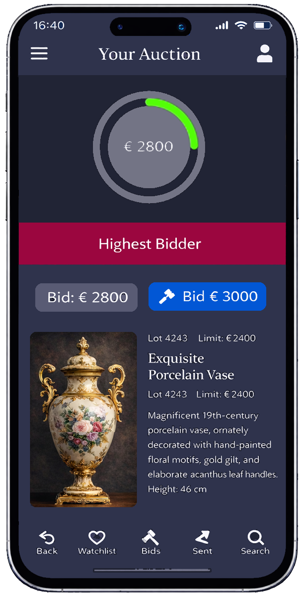 アプリを使用すると、入札者はプッシュ通知も受け取ります – 例えば入札時、入札超過、オークションの勝利、またはロットの終了間際に。この機能により、ユーザーは頻繁に「確認する」必要がなく、正確なタイミングでリマインダーが送信されるため、参加率が大幅に向上します。