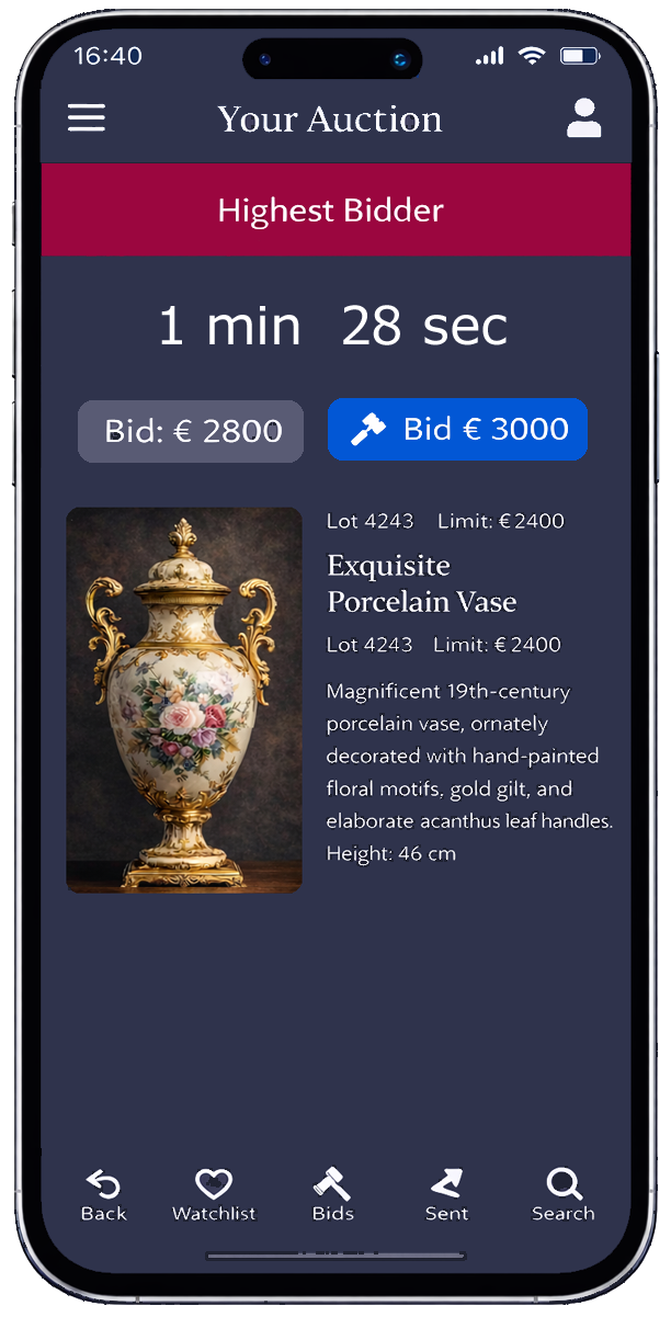 オークションハウスコンソールを使用することで、従来の会場オークションをインターネットに追加で配信できます - 同期的かつ追跡可能です。オークションハウスのスタッフがコンソールを操作し、入札進行、落札、ロット変更をリアルタイムで配信します。オンライン入札者は、ウェブサイトやアプリを通じてビデオやライブ入札を追跡し、遅延なしで入札できます。例えば、自動入札エージェントの入札を使用した隠れた入札手順も実現可能です。オンライン入札者は、常に最高入札者であるか、会場からのリーディングビッドか、または外部ライブコンソールからのものかを確認でき、いつでも入札を上げることができます。